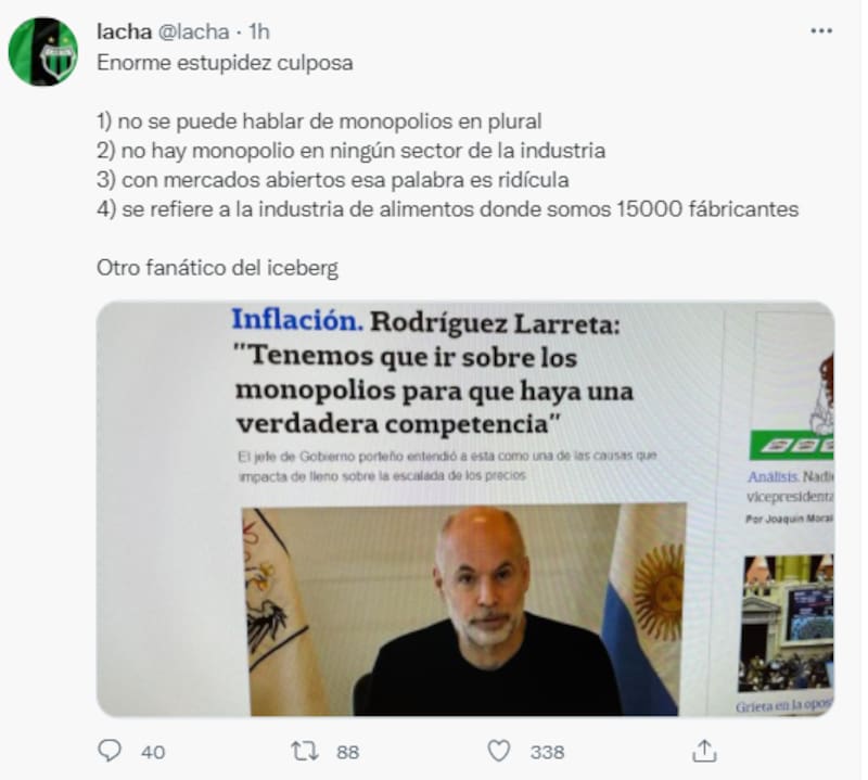 En ese eje, enumeró: "1) no se puede hablar de monopolios en plural, 2) no hay monopolio en ningún sector de la industria, 3) con mercados abiertos esa palabra es ridícula, 4) se refiere a la industria de alimentos donde somos 15000 fabricantes". Y a modo de cierre, lanzó: "Otro fanático del iceberg".