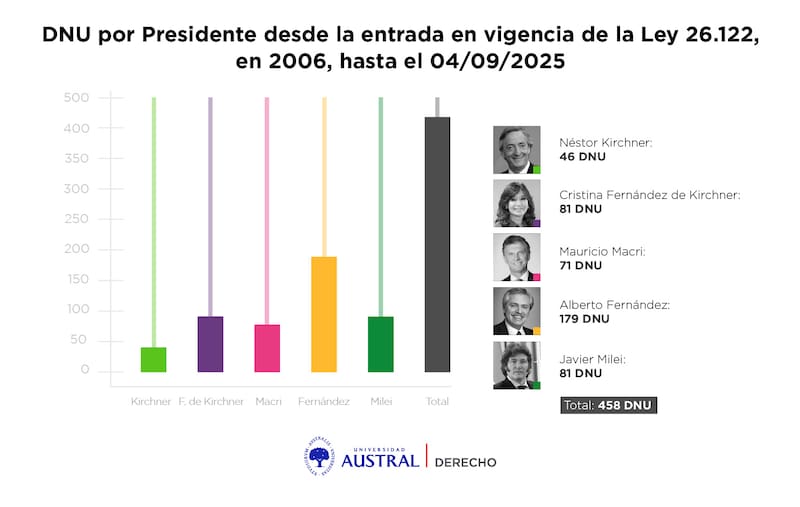 Los gobiernos kirchneristas, primero con Néstor Kirchner y luego con Cristina Fernández, mantuvieron un uso sostenido que acumuló alrededor de 200 decretos en total. Mauricio Macri, con minoría legislativa, recurrió a unos 70, en especial en sus primeros años. Alberto Fernández firmó cerca de un centenar, con picos durante la pandemia.