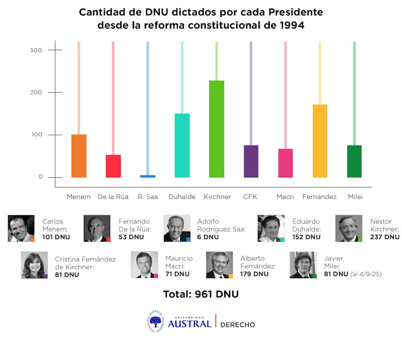 El informe también traza un ranking de los presidentes que más apelaron a esta vía. Carlos Menem inauguró la práctica en los años 90 con más de un centenar de decretos firmados en dos mandatos. Fernando de la Rúa, en apenas dos años, superó la treintena.