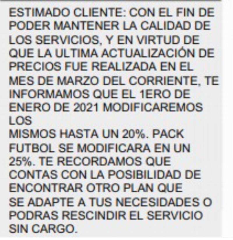 "Con el fin de poder mantener la calidad de los servicios y en virtud de que la última actualización de precios fue realizada en el marzo de este año, informamos que el 1 de enero de 2021 modificaremos los mismos hasta un 20%", informó en la factura de diciembre la empresa Cablevisión Fibertel a sus clientes.