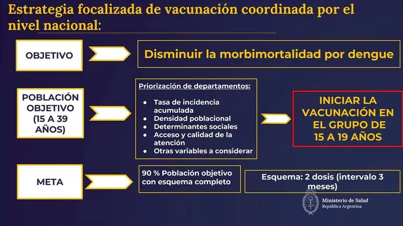 La decisión fue comunicada durante la presentación del plan de trabajo para el abordaje integral del dengue para los años 2024-2025. Según informaron, la vacunación se llevará a cabo de manera escalonada, comenzando por el rango etario de 15 a 19 años y avanzando progresivamente, según la disponibilidad de vacunas