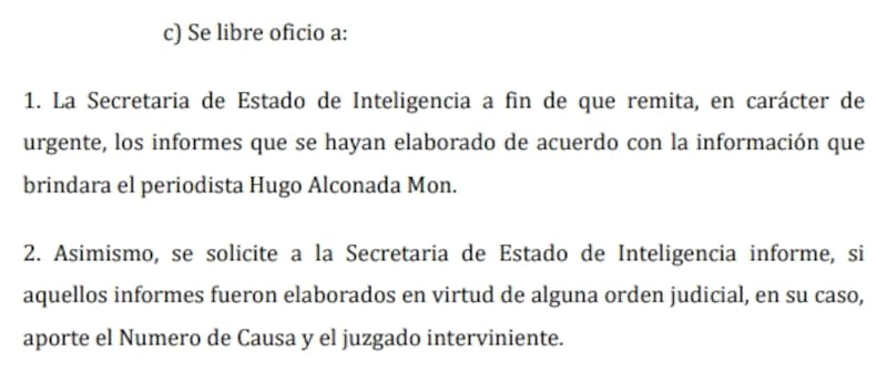 Desde las centrales se pide que se convoque a prestar declaración testimonial al periodista que dio cuenta la información y se libre oficio a la SIDE a fin de que remita, "en carácter de urgente, los informes que se hayan elaborado de acuerdo con la información" publicada y que, además, se informe si aquellos informes fueron elaborados en virtud de alguna orden judicial.