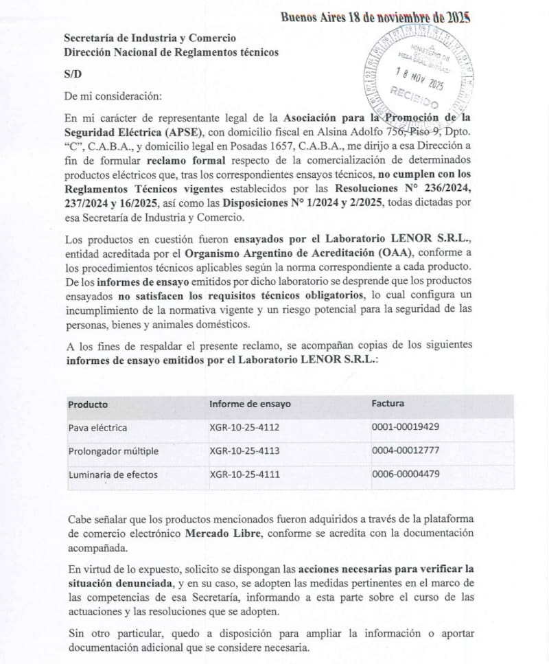 La denuncia destaca que los productos fueron adquiridos por Mercado Libre y solicita que “se dispongan las acciones necesarias para verificar la situación denunciada”. En consecuencia, solicita a la Secretaría que “se adopten medidas pertinentes en el marco de las competencias”.