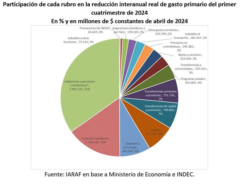 Acorde a los datos oficiales del INDEC, una familia tipo de dos adultos y dos menores necesitó $828.158 en abril para no caer bajo la línea de la pobreza. El superávit fiscal que tanto pondera el Gobierno, consignaron desde ATE, "se asienta fundamentalmente sobre el recorte de las jubilaciones y salarios de los estatales". Un informe del IARAF muestra que el 43% del ajuste se explica por esas dos variables: un 35% en jubilaciones y pensiones y un 8% en salarios públicos.