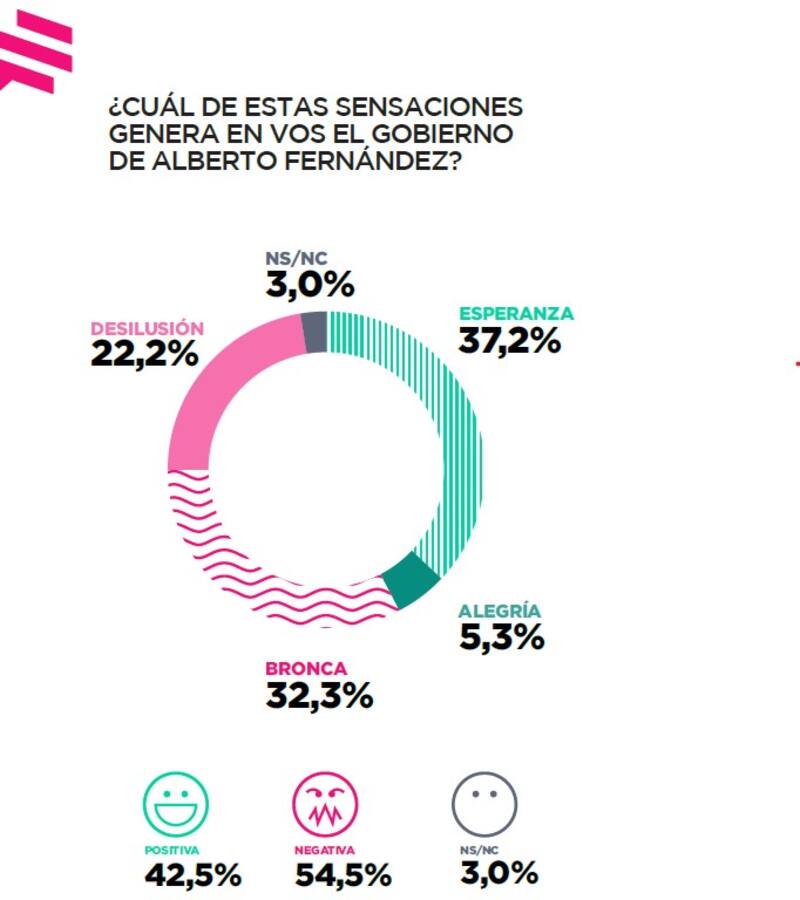 En primer lugar, consulta sobre las sensaciones que despierta el gobierno de Alberto Fernández. En este sentido, la desilusión (22%) y la bronca (32%) le ganan como sentimientos negativos a la esperanza (37%) y la alegría (5%), los positivos.
