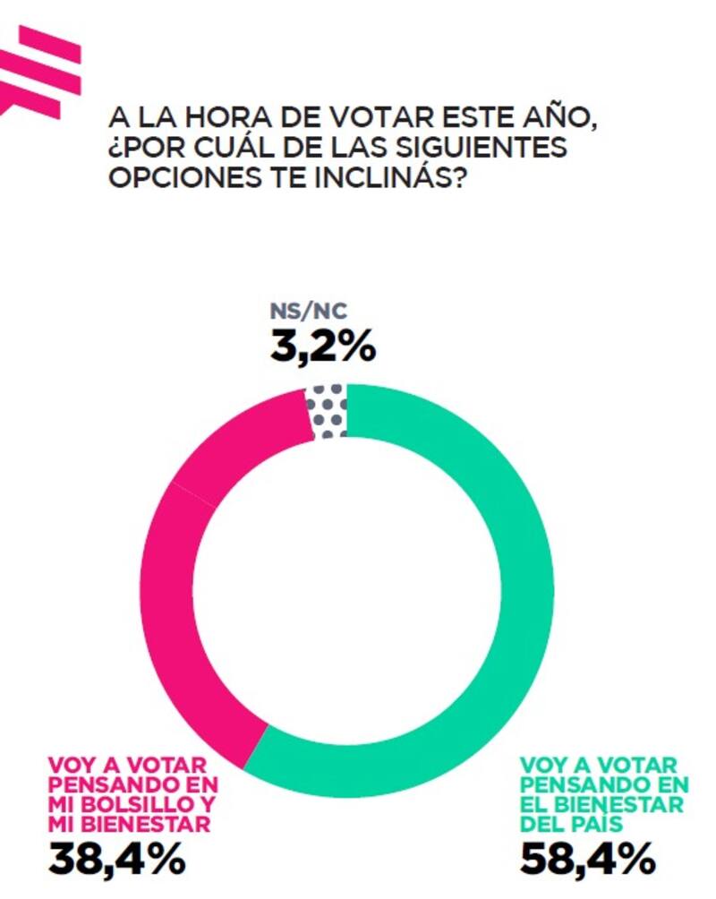Finalmente, el relevamiento indaga sobre las motivaciones del voto. El 58% asegura que irá a las urnas "pensando en el bienestar del país", mientras que el 38% privilegiará "mi bolsillo y mi bienestar". La primera opción cuenta con más adeptos entre el grupo de entre 16 a 24 años con respecto al de 25-30; y más entre las mujeres que entre los varones.