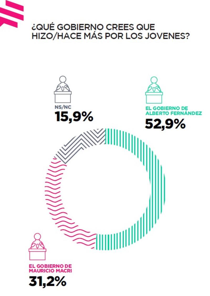 Sin embargo, si se compara con el gobierno de Mauricio Macri, Fernández sale mejor parado. El 53% cree que la actual administración hace más por los jóvenes que la anterior, mientras que el 31% opina lo contrario.