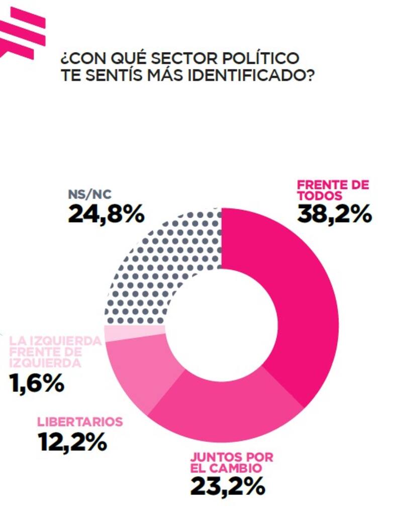 Por otro lado, si bien no se consulta específicamente sobre qué candidato elegirán, si se detiene sobre la preferencia de los distintos espacios políticos. El Frente de Todos, con el 38%, es el que concentra la mayor cantidad de respuestas. Le sigue Juntos por el Cambio, con el 23%. Luego, los sectores libertarios llegan al 12%, y la izquierda queda relegada, con menos del 2%.
