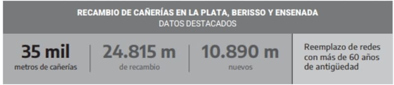 “Entre las tipologías de los trabajos se destacan obras de ampliación y optimización de las redes de agua potable y saneamiento; recambios de cañerías; intervenciones y mejoras en plantas de tratamiento cloacal y en plantas potabilizadoras; perforaciones de pozos de agua potable”, se informó oficialmente.