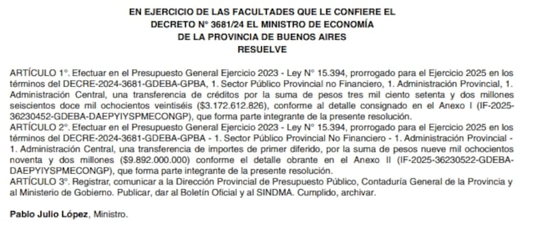 La noticia se conoció por vía indirecta gracias a la publicación en el Boletín Oficial de una adecuación presupuestaria que autoriza la transferencia de más de $13.000 millones destinados a fortalecer las partidas del Ministerio de Infraestructura y Servicios Públicos de la Provincia de Buenos Aires.