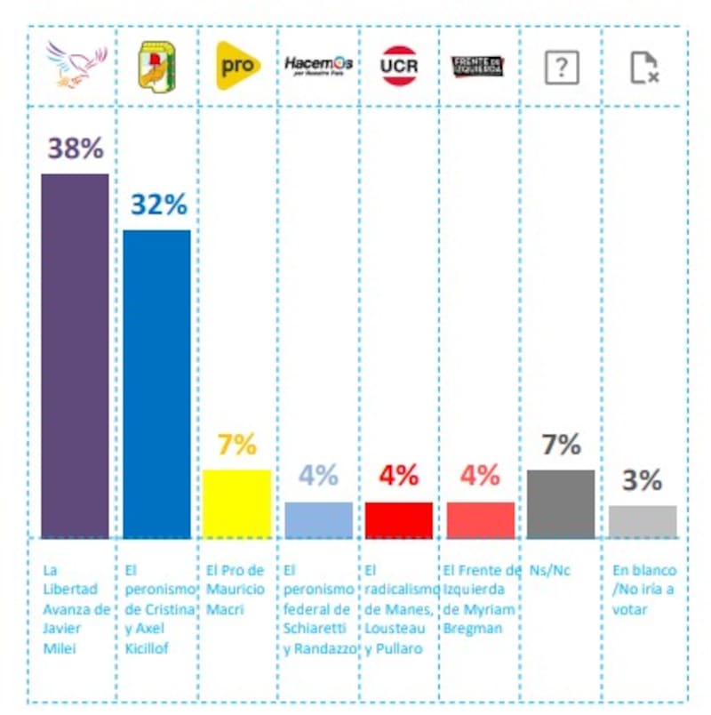 Pese a estas turbulencias recientes, y pensando en clave electoral, La Libertad Avanza (38%) se mantiene como el espacio más votado, con el peronismo (32%) representado por CFK y Kicillof como principal amenaza.