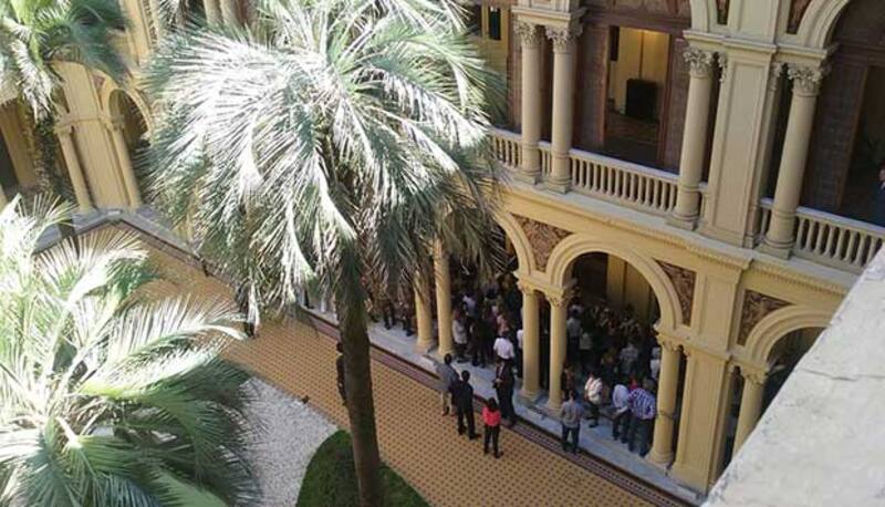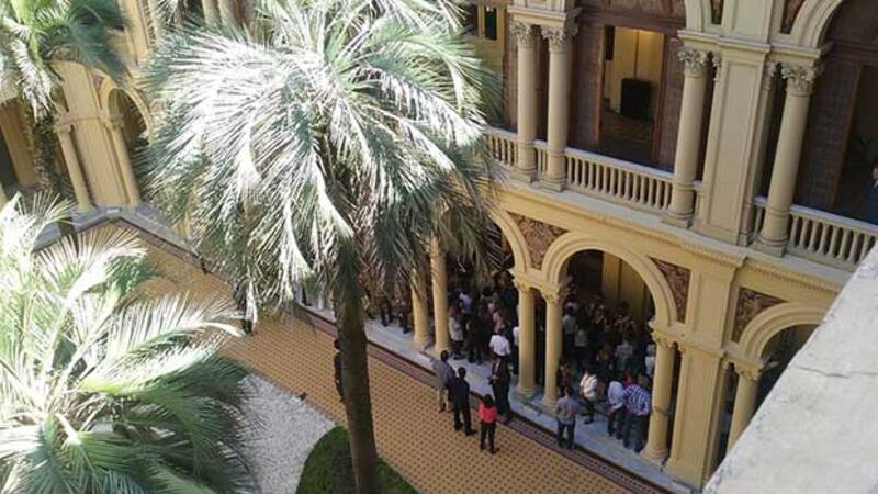 Igualmente, la mayoría de los funcionarios de la casa se agolparon en el patio de Palmeras para ver llegar a Obama a las 10:58, quien fue recibido por los Granaderos.