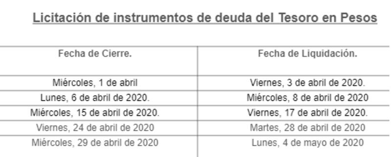 La primera licitación de títulos será el miércoles 1° de abril (con liquidación el 3), la segunda será el lunes 6 de abril (con liquidación el 8), la tercera será el miércoles 15 (con liquidación el 17), la cuarta será el viernes 24 (con liquidación el 28) y la quinta será el miércoles 29 (con liquidación el 1° de mayo).