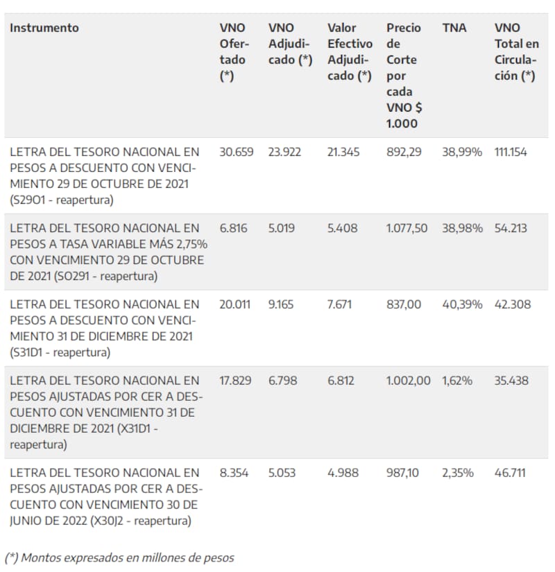 Cuatro de las cinco letras que se ofrecieron hoy vencen en 2021 y, la restante, el próximo año. Según detalló el informe del organismo se reabrieron las letras LEDE, LEPASE y LECER con vencimiento 29 de octubre y 31 de diciembre de este año. Y, a su vez, se reabrió una letra LECER con vencimiento 30 de junio de 2022.