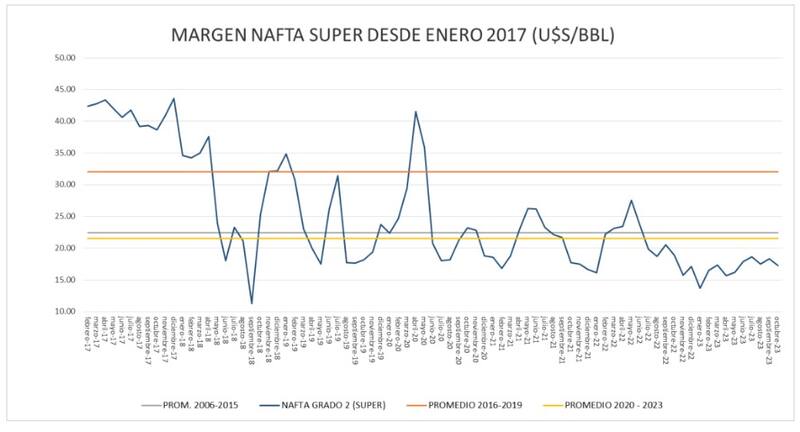 Según la web todohidrocarburos.com, del consultor y ex subsecretario de Combustibles Alberto Fiandesio, los márgenes brutos de refinación de la nafta estaban en octubre en torno a los 11 centavos de dólar por litro y se encuentran por debajo del promedio histórico, mientras que en el gasoil están por encima del promedio.