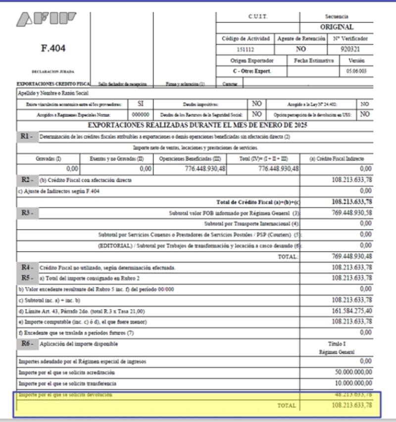 En este punto resulta primordial vincular el crédito y el débito fiscal obtenido en el proceso de exportación que se realiza a través de un trámite en la Agencia de Recaudación y Control Aduanero (ARCA) a través del Formularios 404 y el 731.