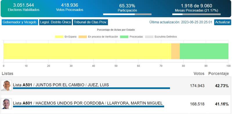 Con el conteo detenido en el 94,90% de las mesas escrutadas Martín Llaryora, de Hacemos Unidos por Córdoba, aventaja a Luis Juez, de Juntos por el Cambio, por tres puntos porcentuales.
