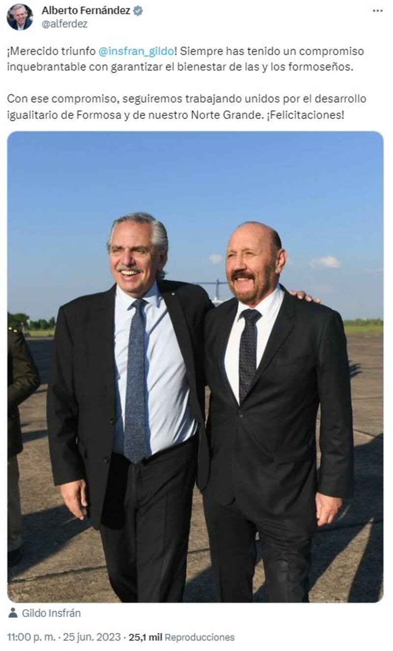 ¡Merecido triunfo @insfran_gildo! Siempre has tenido un compromiso inquebrantable con garantizar el bienestar de las y los formoseños", tuiteó el Presidente.