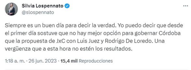 "Siempre es un buen día para decir la verdad. Yo puedo decir que desde el primer día sostuve que no hay mejor opción para gobernar Córdoba que la propuesta de JxC con Luis Juez y Rodrigo De Loredo. Una vergüenza que a esta hora no estén los resultados", posteó la legisladora.