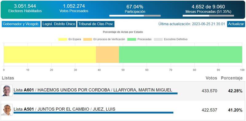 En un lento escrutinio pero con más del 70% de las mesas escrutadas Martín Llaryora, de Hacemos Unidos por Córdoba, da vuelta la elección y ahora aventaja a Luis Juez, de Juntos por el Cambio, por casi tres puntos porcentuales, en las elecciones que, para gobernador y otros cargos, se llevan adelante en Córdoba.