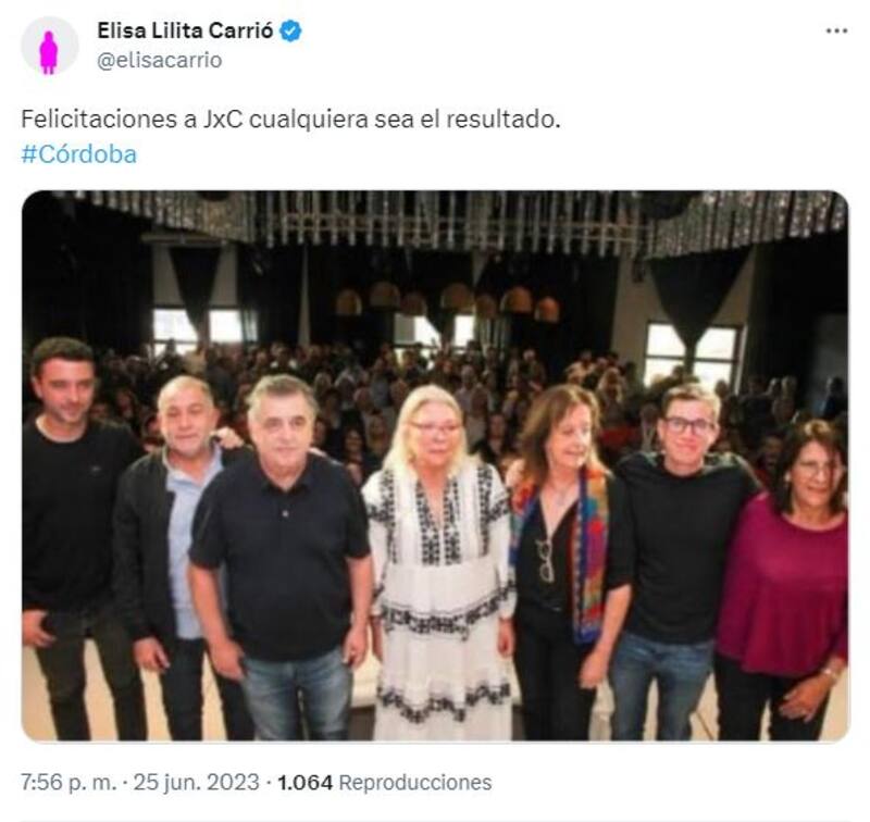 "¡Elección histórica de Juntos por el Cambio en Córdoba! Felicitaciones a @ljuez, a @marcoscarasso y a los cientos de miles de cordobeses que dijeron claramente que el cambio en Córdoba está cada vez más cerca", posteó en su cuenta de Twitter.