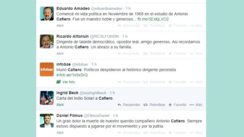 Dirigentes de todos los partidos políticos recordaron hoy, a través de la red social Twitter, la figura y el legado de Antonio Cafiero, quien falleció hoy a los 92 años, tras una extensa carrera política.