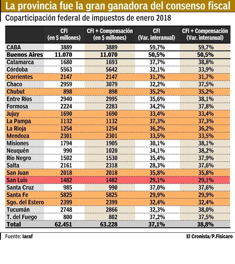 La provincia de Buenos Aires fue la gran ganadora del consenso fiscal firmado a fines del año pasado y ya comienza a verse en la coparticipación de impuestos. En enero, el primer mes de vigencia del pacto, la coparticipación a los bonaerenses subió 50,5%, mientras que al promedio del resto de las provincias que adhirieron a la norma el reparto de impuestos avanzó 37,1%, según un informe del Instituto Argentino de Análisis Fiscal (IARAF).