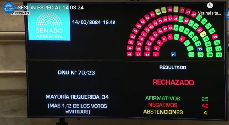 Por 42 votos en contra, 25 a favor y cuatro abstenciones, la Cámara de Senadores rechazó el DNU N° 70/2023, que modifica, sustituye o deroga más de 100 leyes o decretos.
