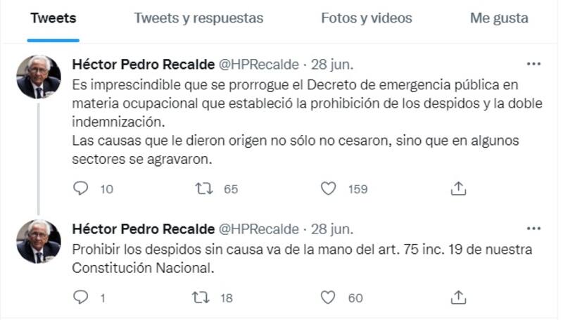 Fue a través de su cuenta de Twitter, en la que pidió que continúe la prohibición de despidos y la doble indemnización en el marco de la emergencia ocupacional, debido a que "las causas que le dieron origen no sólo no cesaron, sino que en algunos sectores, se agravaron".