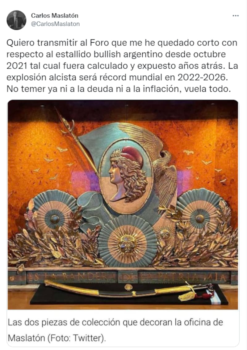 "Quiero transmitir al Foro que me he quedado corto con respecto al estallido bullish argentino desde octubre 2021 tal cual fuera calculado y expuesto años atrás", apuntó el señalado como uno de los hombres clave en el armado nacional del diputado Javier Milei vía Twitter.