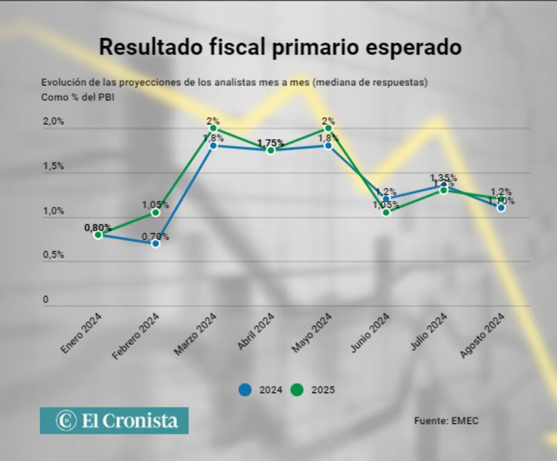 Respecto al resultado fiscal primario, frente a la falta de piso de la actividad y los interrogantes sobre si se van a compensar los ingresos de la baja del impuesto PAIS, moderan la proyección: 2024 cerraría con un superávit del 1,10%, 0,25 p.p menos que lo que indicaron el mes anterior.