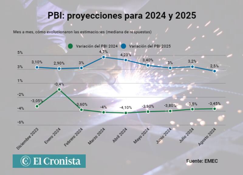 En cuanto a la actividad, a pesar de las estimaciones continúan en un terreno negativo, por segundo mes consecutivos mostraron una leve mejora al considerar que el primer año de Gobierno de Milei terminará con una caída del Producto Bruto Interno (PBI) del 3,45% (0,05 p.p de diferencia respecto al mes anterior -3,5%).
