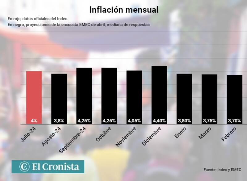 De cara al segundo año de mandato, en el primer trimestre del 2025 la inflación se ubicaría un escalón más abajo. En enero, el IPC sería del 3,80% para a posteriori tener un leve descenso: en marzo rondaría 3,75% y en abril 3,70%.