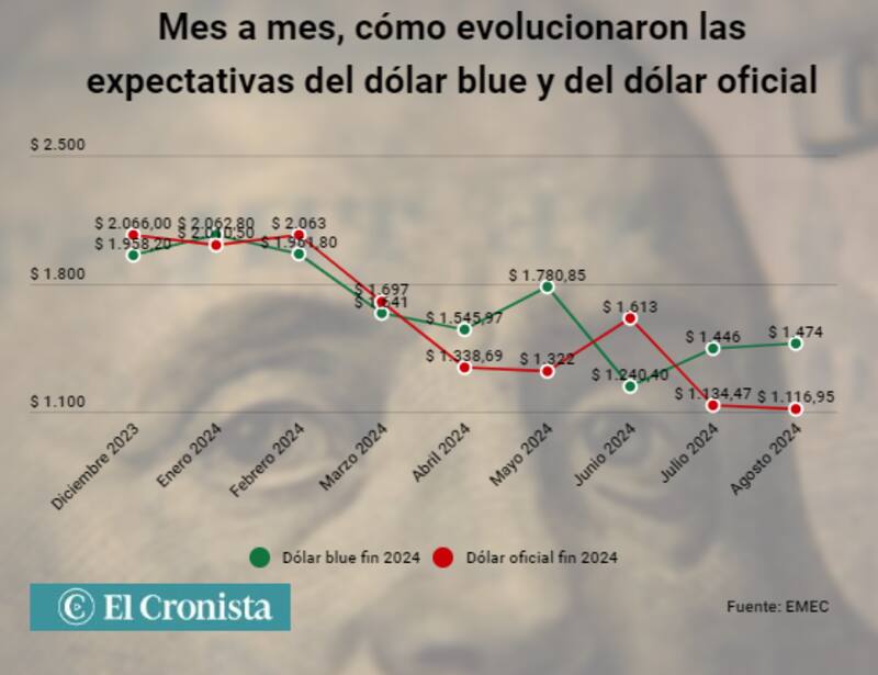 Aunque lejos quedo del salto que arrojó la consulta de julio pasado, en donde la mediana de las respuestas arrojó que para fin de 2024 estaría en $ 1.613, una proyección que se moderó fuertemente al mes siguiente ($ 1.113,47).