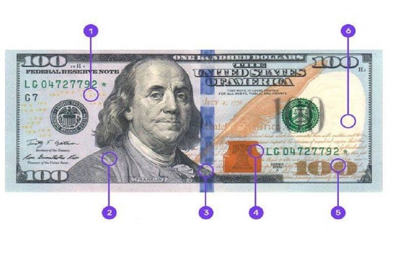 Los dólares falsos de 100 presentan la figura de Franklin en forma muy obvia que se ve a simple vista, lo cual no ocurre en los billetes verdaderos.