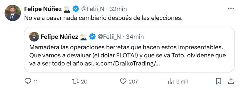 En respuesta a un análisis sobre el futuro del dólar y del ministro de Economía, Luis Caputo, en relación con las elecciones de octubre, uno de sus asesores salió a aclarar en redes sociales.