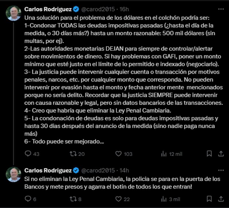 Carlos Rodríguez, muy cercano a Javier Milei antes de su llegada a la presidencia, propuso en su cuenta en X lo que denominó como una "solución para el problema de los dólares en el colchón" con una serie de puntos: