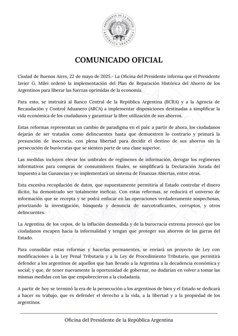 Ahora, a raíz del equilibrio fiscal que el Gobierno sostiene "por decisión política", según marcó Caputo, se apuesta apuesta al nuevo "Plan de Reparación Histórica" de los ahorros de los argentinos: "Ahora la sociedad demanda más moneda".