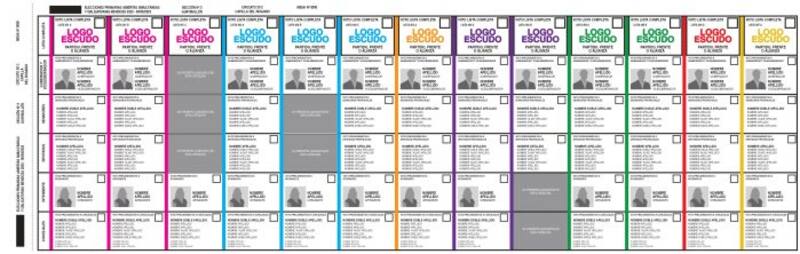 La boleta tendrá 68 cm de largo por 12,5 de alto y estará impresa de ambos lados. Además, tendrá un anverso de color verde que será para cerrar el voto y una cara en donde se encuentra dividido por colores, logo y escudo cada una de las agrupaciones.