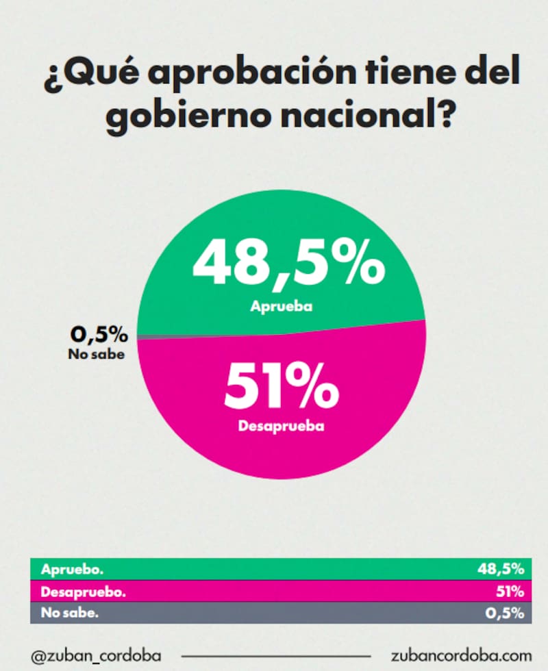 Los datos del último informe de Zuban Córdoba & Asociados revelan un escenario de paridad casi perfecta: el 48,5% de la población aprueba la gestión del Gobierno nacional, mientras que el 51% la desaprueba.