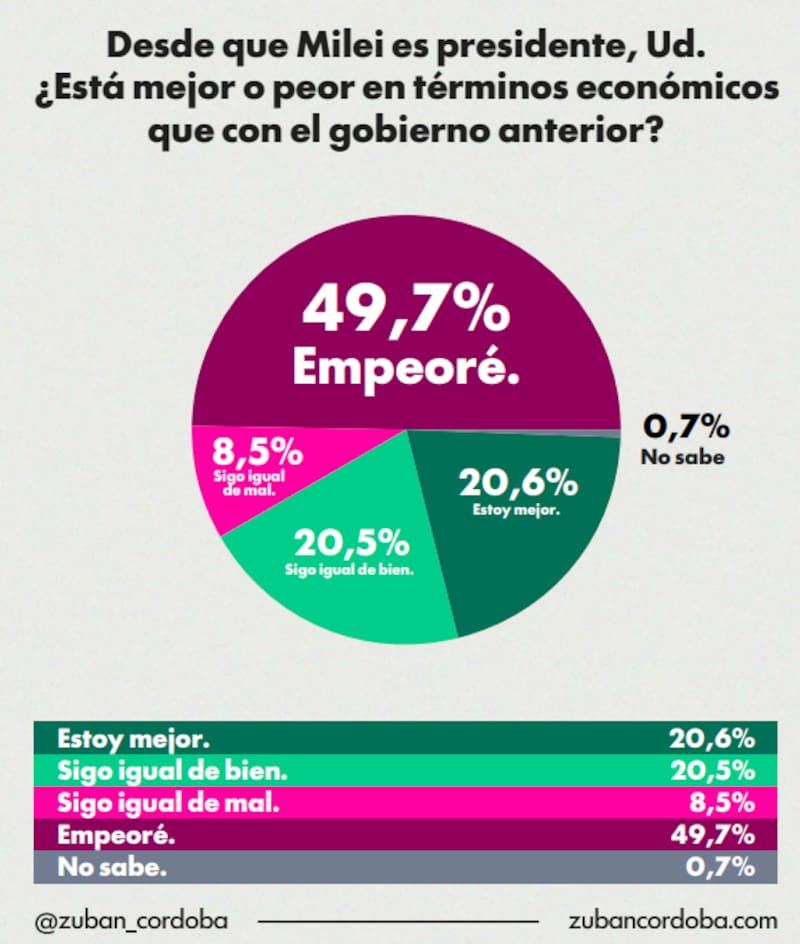 En la encuesta de Zubán Córdoba, la economía doméstica aparece como el principal factor explicativo del desgaste. Casi la mitad de los argentinos (49,7%) afirma estar peor en términos económicos que con el gobierno anterior, frente a apenas un 20,6% que dice estar mejor. Sin embargo, este deterioro material no se traduce automáticamente en una debacle política para el Presidente. Milei conserva un núcleo duro cohesionado, más identitario que coyuntural, que sigue funcionando como ancla de su poder.
