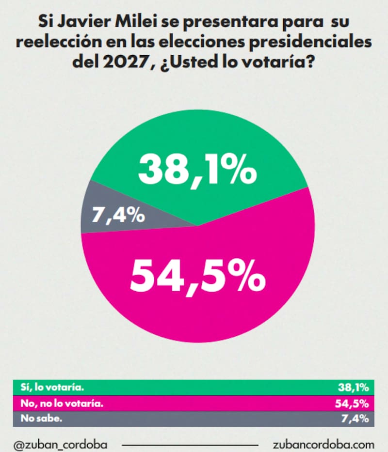 Ese núcleo explica, en buena medida, un dato clave de la encuesta: ante la hipótesis de una reelección en 2027, el 38,1% asegura que volvería a votarlo. Aunque la mayoría hoy responde que no lo haría (54,5%), el nivel de fidelidad dentro de su electorado original es alto. Entre quienes lo votaron en el ballotage de 2023, más de siete de cada diez volverían a acompañarlo. En términos políticos, Milei no necesita convencer a todos: le alcanza con sostener su base y aprovechar un sistema opositor fragmentado.