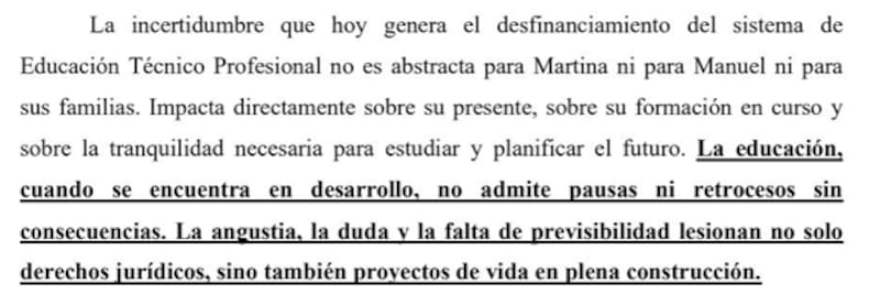 El escrito señala, además, que la educación técnica, en los dos años de gobierno libertario, ya ha tenido un recorte que alcanza el 93% en el presupuesto 2026 respecto a valores equivalentes de 2023.