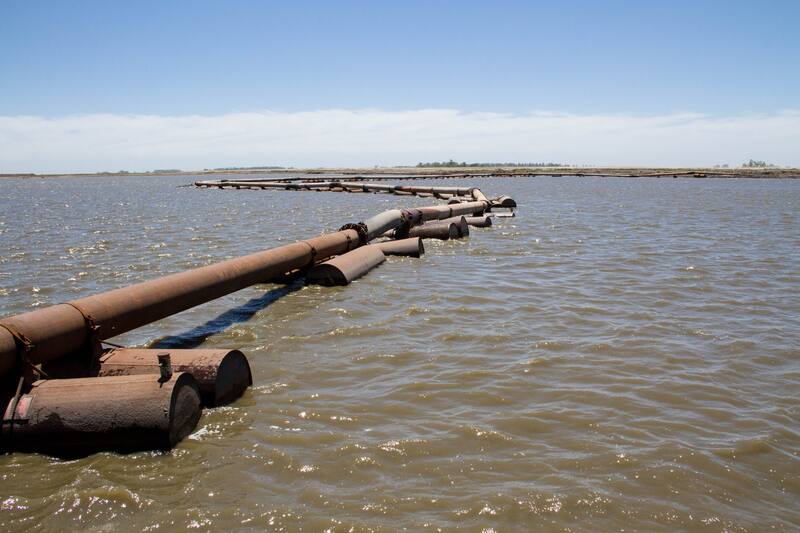 En el corazón de la draga se aloja una bomba que permite que el suelo triturado pase a una cañería que comienza en la embarcación, atraviesa el río hasta la orilla, y continúa por tierra hasta un recinto con terraplenes que funciona como olla contenedora a 200 metros del agua.