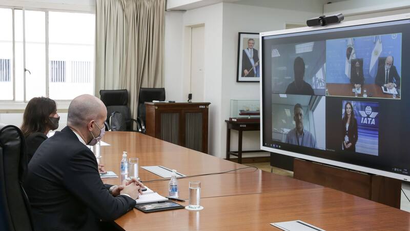 El encuentro virtual -duró 10 minutos- se realizó a pedido de directivos de la Asociación Internacional de Transporte Aéreo (IATA), para analizar la situación de los argentinos que quedaron varados en el exterior, que ya rondan los 15 mil, según las aerolíneas.