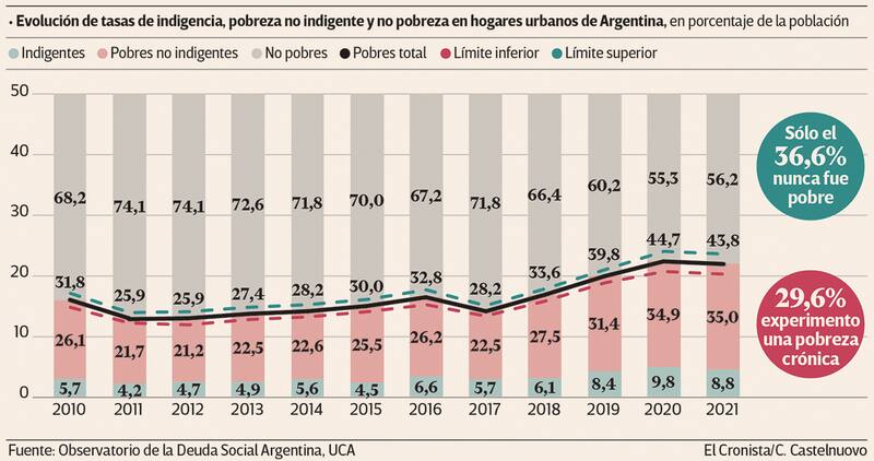 Según el reporte, 3 de cada 10 argentinos nunca dejaron de ser pobres en la última década, 3 de cada 10 lo fueron al menos en algún momento. En este contexto, 4 de cada 10 argentinos son pobres tanto por ingresos como por privaciones elementales, y, entre ellos, 1 de cada 10 experimenta hambre de manera cotidiana.