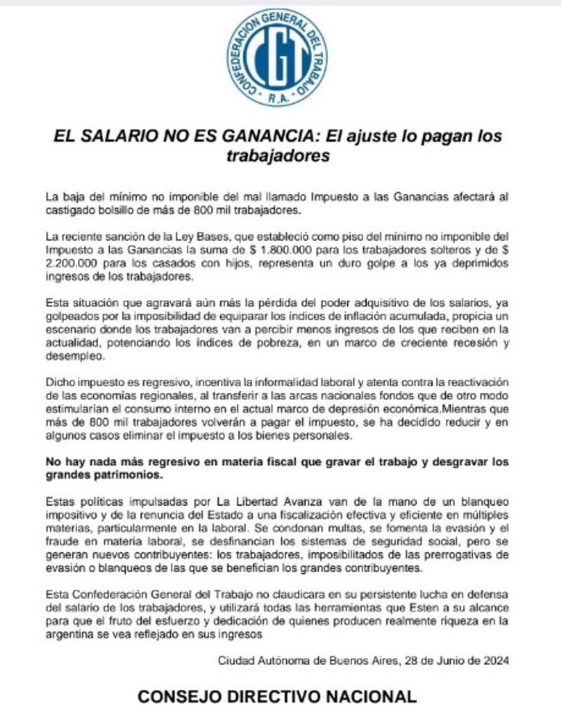 La Confederación General del Trabajo (CGT) reaccionó este sábado a la aprobación de la Ley Bases y el denominado paquete fiscal y puso el foco en la restauración de lacuarta categoría de Ganancias, a la que rechazó rotundamente.