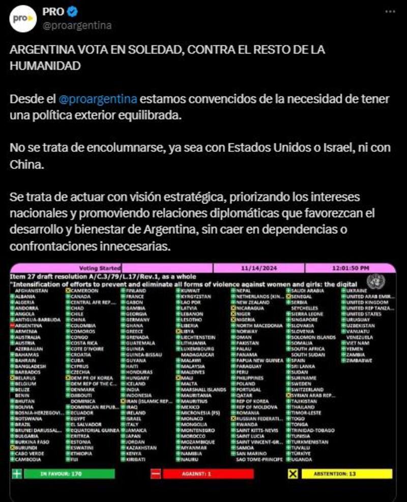 Horas después de que se conociera una polémica decisión del Gobierno de Javier Milei, donde Argentina fue el único país en rechazar una resolución en la ONU para combatir la violencia contra las mujeres y niñas, el PRO salió al cruce para cuestionar esta postura en un nuevo cortocircuito entre el oficialismo y el partido liderado por Mauricio Macri.