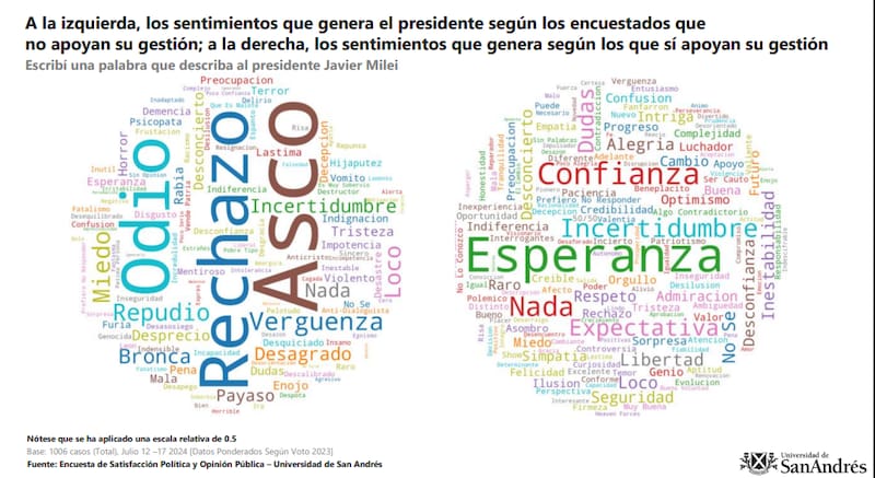 La Universidad de San Andrés dividió los sentimientos que despierta el Presidente en los encuestados en positivos y negativos. Entre los más positivos están: confianza, esperanza e incertidumbre. En cuanto a los negativos se pueden ver: odio, rechazo y asco.