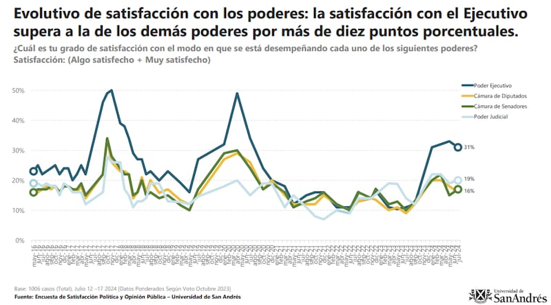 Por otro lado, el grado de satisfacción con el funcionamiento del Poder Ejecutivo es del 31% y supera a la satisfacción con el resto de los poderes por más de diez puntos porcentuales.
